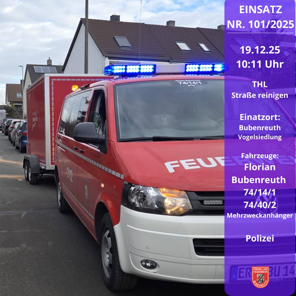 Bubenreuth – Die Integrierte Leitstelle (ILS) Nürnberg alarmierte am 19.12.25 um 10:11 Uhr die Kameraden der Feuerwehr Bubenreuth zu einem Einsatz in der Vogelsiedlung. Grund für die Alarmierung war ein Motorschaden an einem Pkw, bei dem Betriebsmittel auf die Fahrbahn ausgelaufen waren.