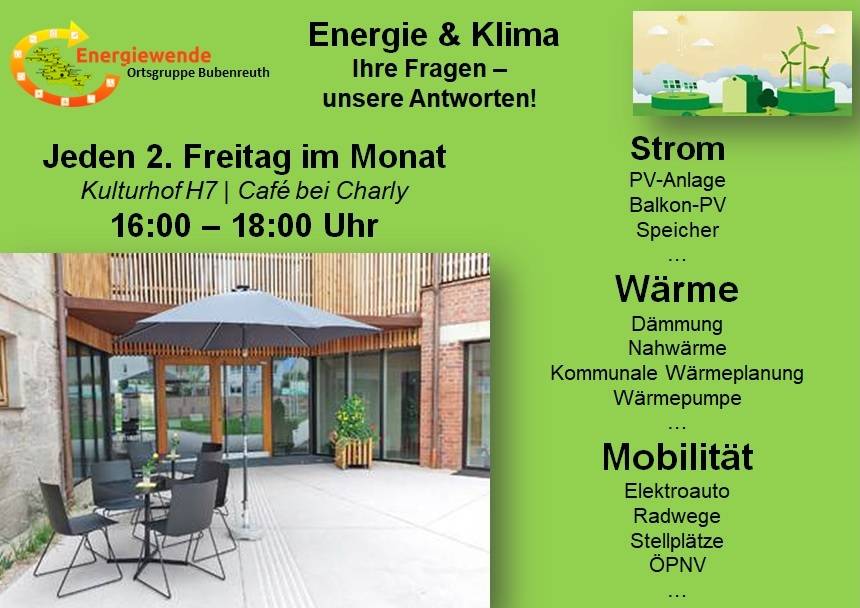 Kommen Sie zu unserer Sprechstunde Energie & Klima im H7 bei Charly, jeden 2. Freitag im Monat - nächster Termin am Freitag, den 13.03.2026 von 16...18 Uhr.