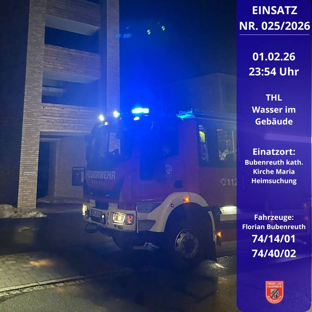 Bubenreuth – In der Nacht zum 2. Februar 2026 wurden die Einsatzkräfte der Feuerwehr Bubenreuth zu einem Wasserschaden in der Birkenallee alarmiert. Die Integrierte Leitstelle (ILS) Nürnberg verständigte die Feuerwehr am 1. Februar 2026 um 23:54 Uhr über einen Einsatz in der Birkenallee 60, dem Gebäude der katholischen Kirche Maria Heimsuchung.