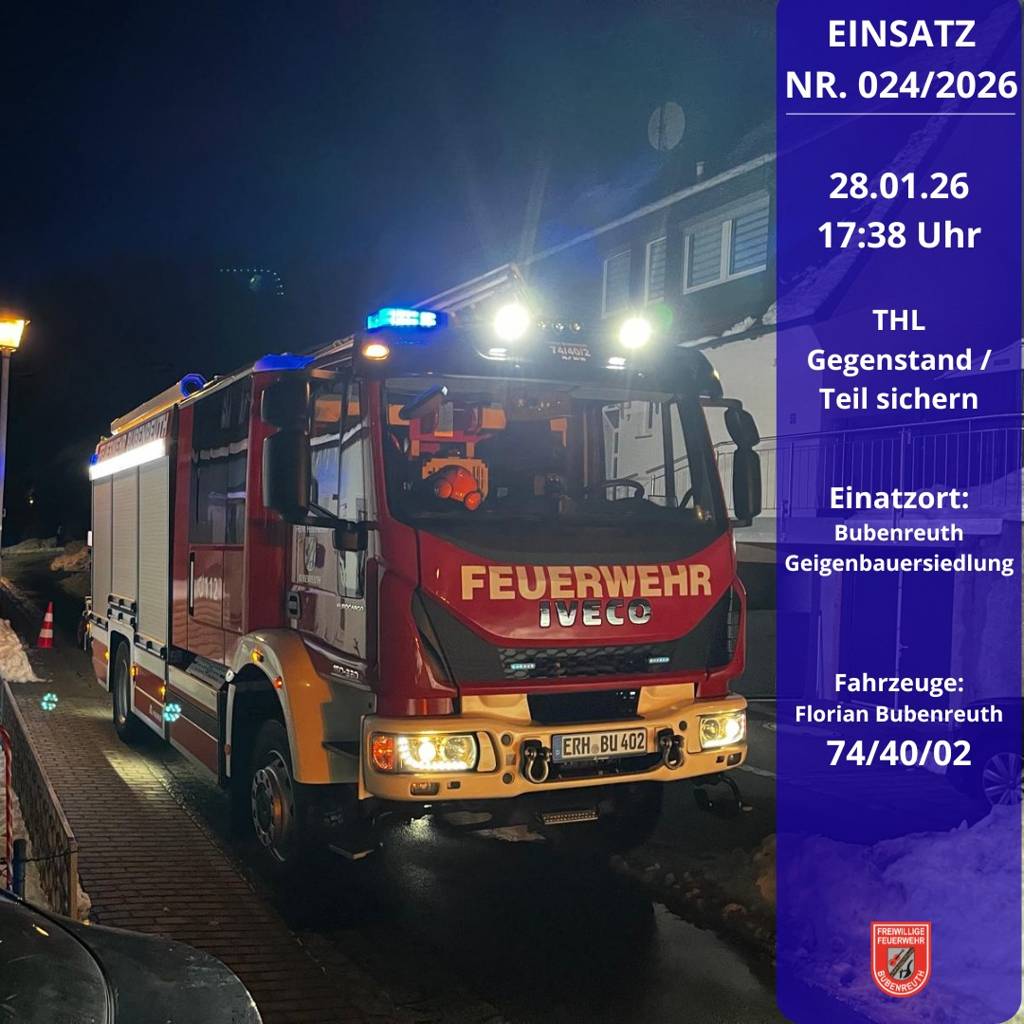 Bubenreut – Am 28. Januar 2026 wurde die Feuerwehr Bubenreut um 17:38 Uhr von der Integrierten Leitstelle (ILS) Nürnberg zu einer Technischen Hilfeleistung in die Geigenbauersiedlung alarmiert. Das Einsatzstichwort lautete „Gegenstand / Teil sichern“.